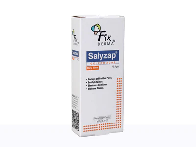 Fixderma Salyzap Gel For Acne Day Time is a non-comedogenic, non-drying, and oil-free gel designed for daily use. It gently exfoliates and heals acne, helping to remove blackheads, whiteheads, and active acne. This lightweight gel contains natural soothing agents like aloe vera, tea tree oil, and clove oil, providing a matte finish and keeping the skin non-greasy and non-shiny.