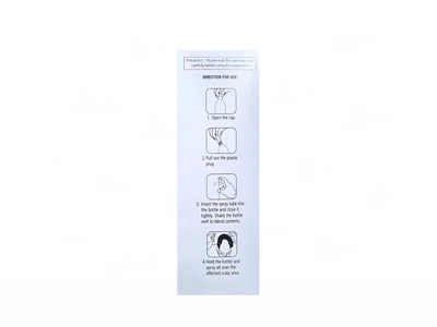 Open the bottle. Remove the seal. Insert the spray applicator firmly into the bottle. Screw it firmly and remove the safety clip. Prime the spray pump by actuating it for 3 to 5 times in air. After aiming the pump toward the centre of the bald area of the scalp, press the pump once and spread it with fingertips to cover all the bald area. Repeat for a total of 5 times, to apply a dose of 1ml of solution.